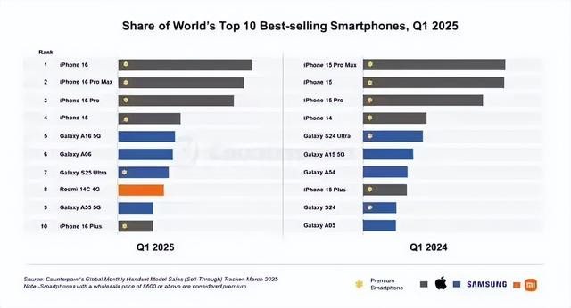喏,五月份就有市场调研机构,发布了2025年第一季度手机销量排行榜。